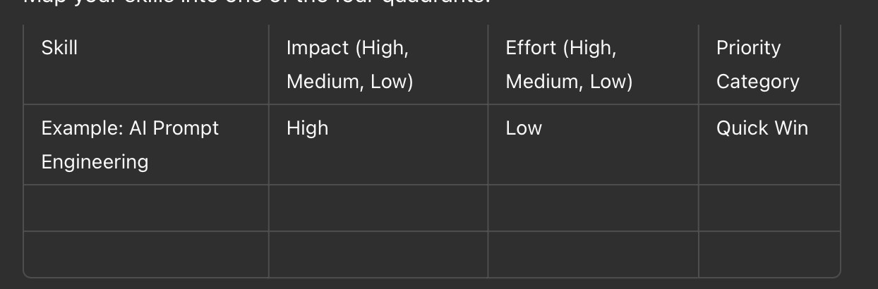 Low Impact, Low Effort (Fill-Ins): These skills are nice to have but won’t move the needle much. Tackle them when you have spare time.