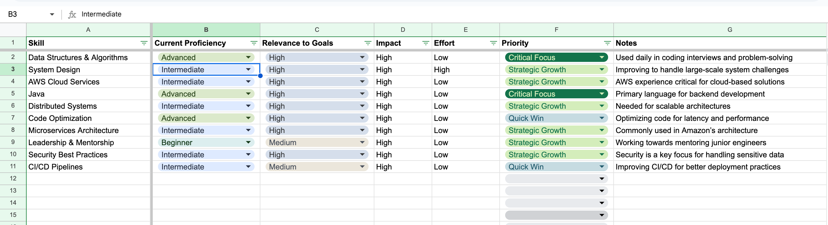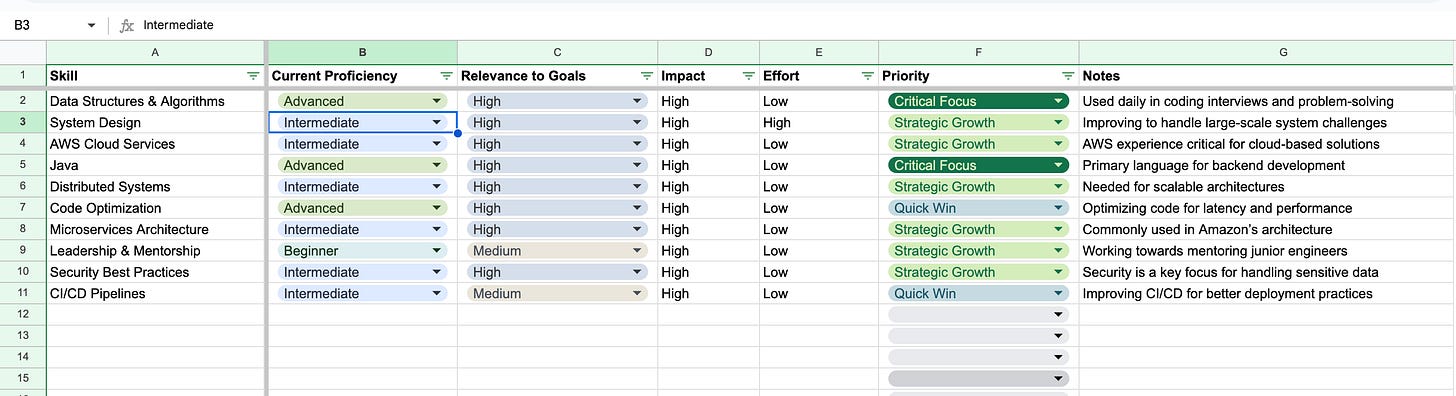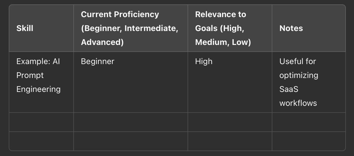 Before you can prioritize, you need to evaluate your current skills and identify gaps. Use this simple template to audit your skills: